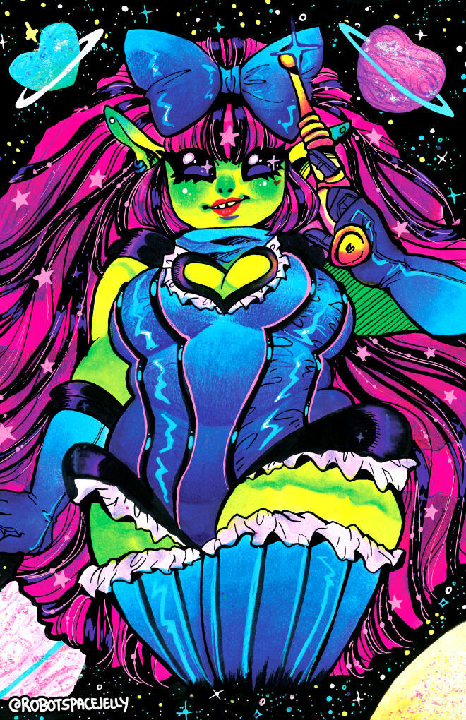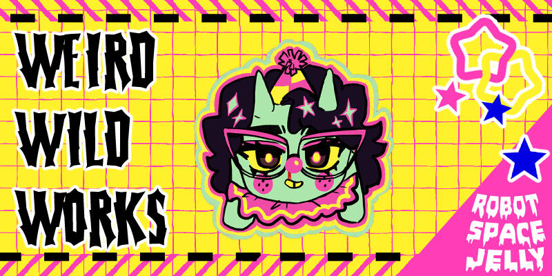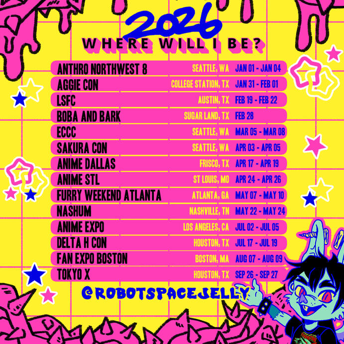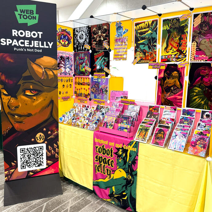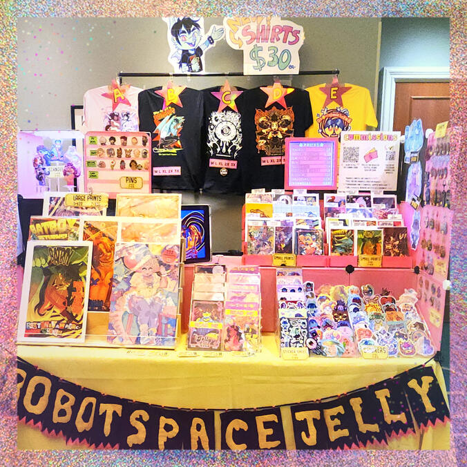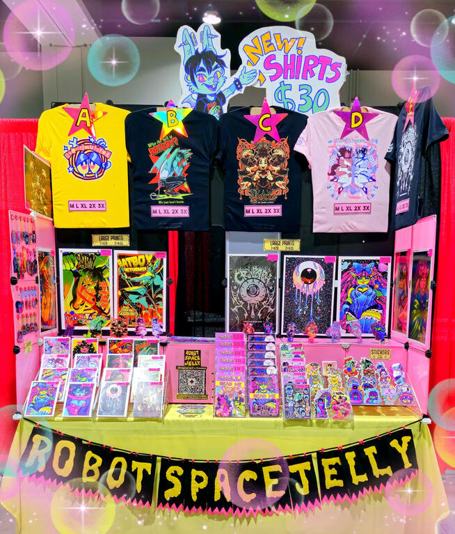 Hi I'm Robotspacejelly! I am a Mexican artist based in Texas currently working on my original webcomics "Punk's not dad", "Heavy Petting" and "Who the hell is Batboy".I love creating original art and characters, I have a big immagination and I love drawing other's characters as well. At ACFI 2025 I did 12 badge Commissions over the weekend and took home another 10 that were mailed out. Every Convention season my commission types changes to another theme weather it's crayon, copic, and soon felt.Shirts and large high quality prints make up the bulk of my sales, stickers, pins and charms are my second best sellers.